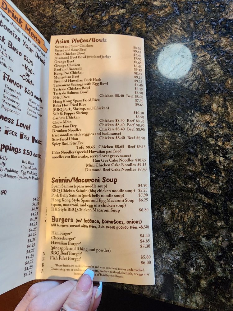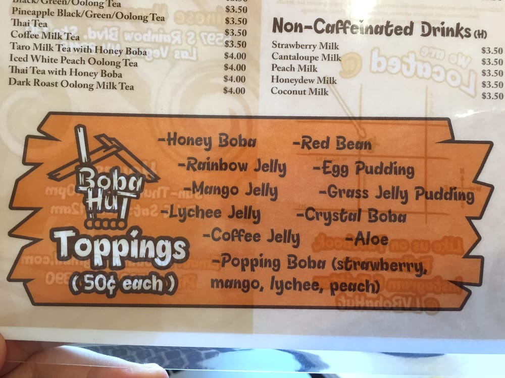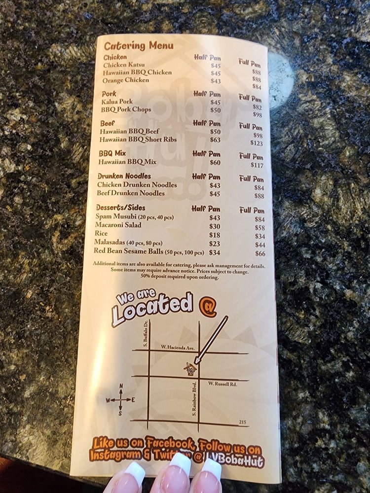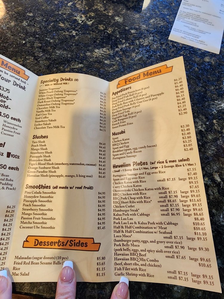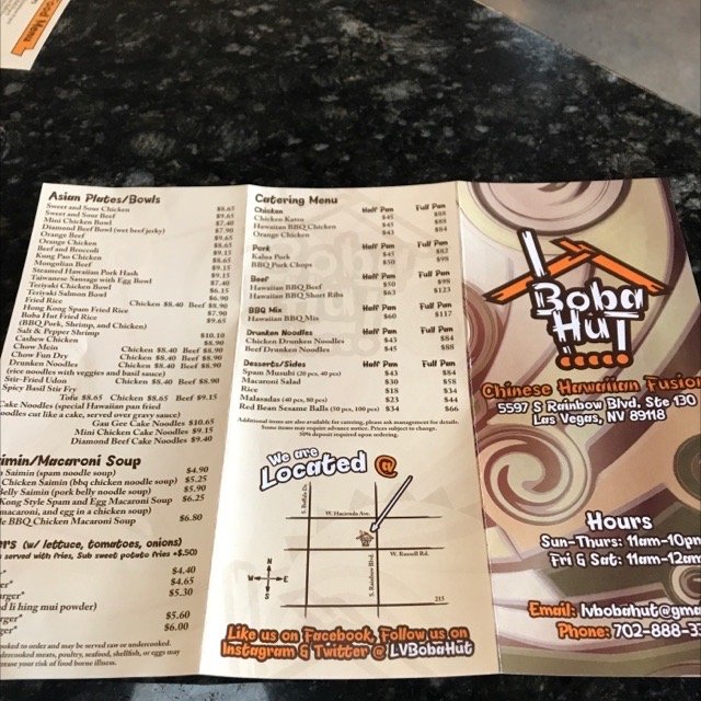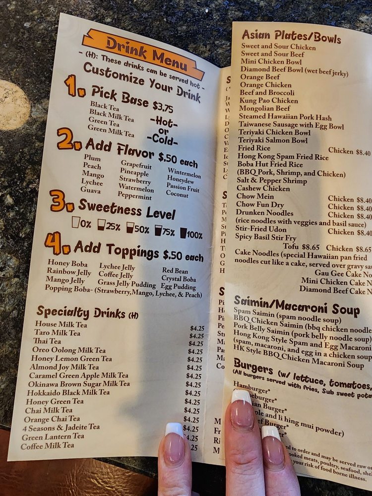 Introducing the menu at Boba Hut, a casual dining spot in Las Vegas offering a variety of beverages and Hawaiian-Asian cuisine. From customizable drinks like black and green tea to specialty options like Taro Milk Tea and Oreo Oolong Milk Tea, there's a refreshing selection for every taste. Don't miss out on their delicious slushes, including Taro and Strawberry flavors. The reviews rave about the crispy gau gee, cake noodles, and tender pork belly "loco moco." Customers also praise the musubi and boba drinks, noting the creamy flavors and average prices. With options for delivery, takeout, and reservations, Boba Hut creates a welcoming atmosphere perfect for groups or a quick bite to eat. Experience the flavors of Hawaii at this hidden gem, where the food is always on point.